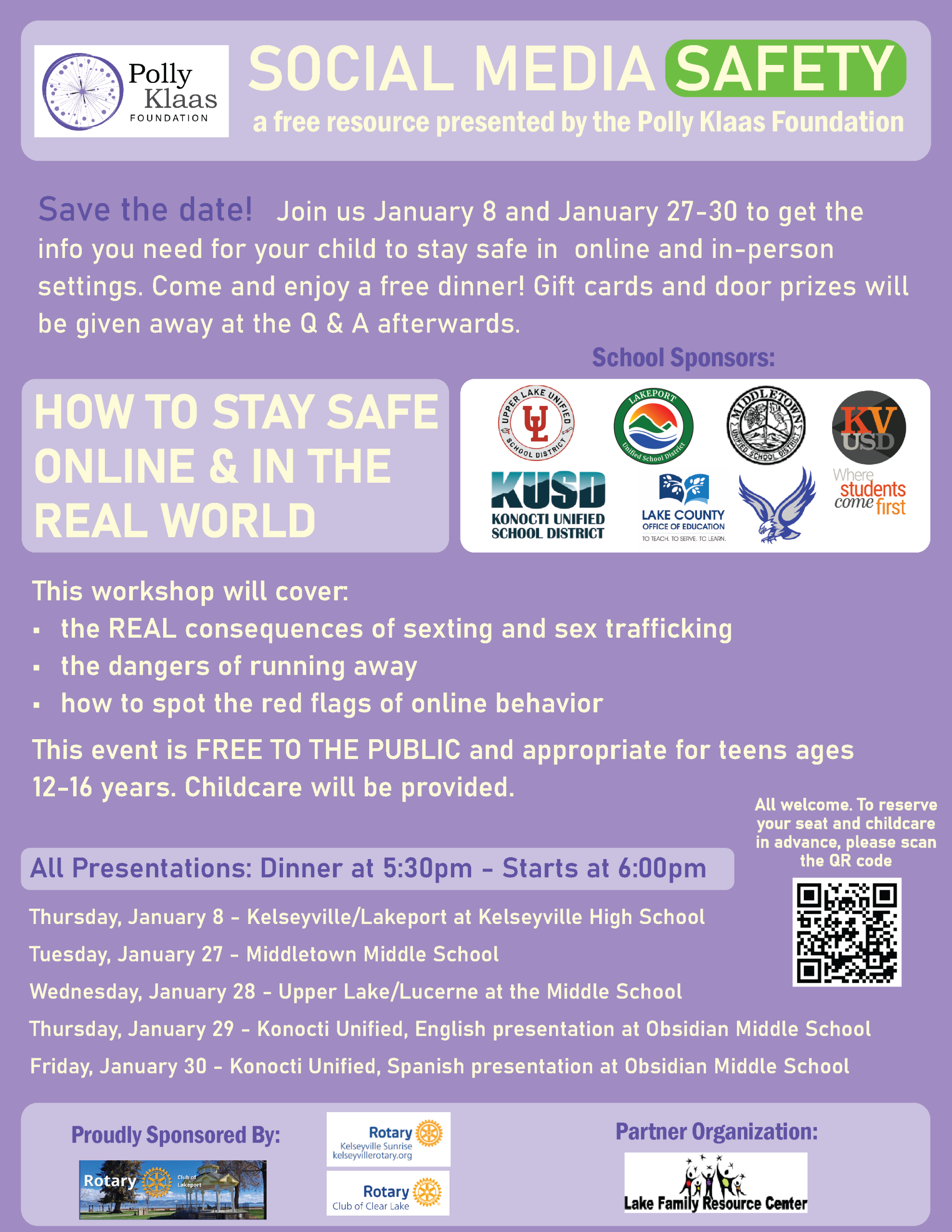 Social Media Safety – A free resource presented by the Pollly Klaas Foundation – Several Dates & Locations in January. This event is FREE TO THE PUBLIC and appropriate for teens ages 12-16 years. Child care will be provided. Join this presentation and get the info you need to keep your child safe online and … Read more